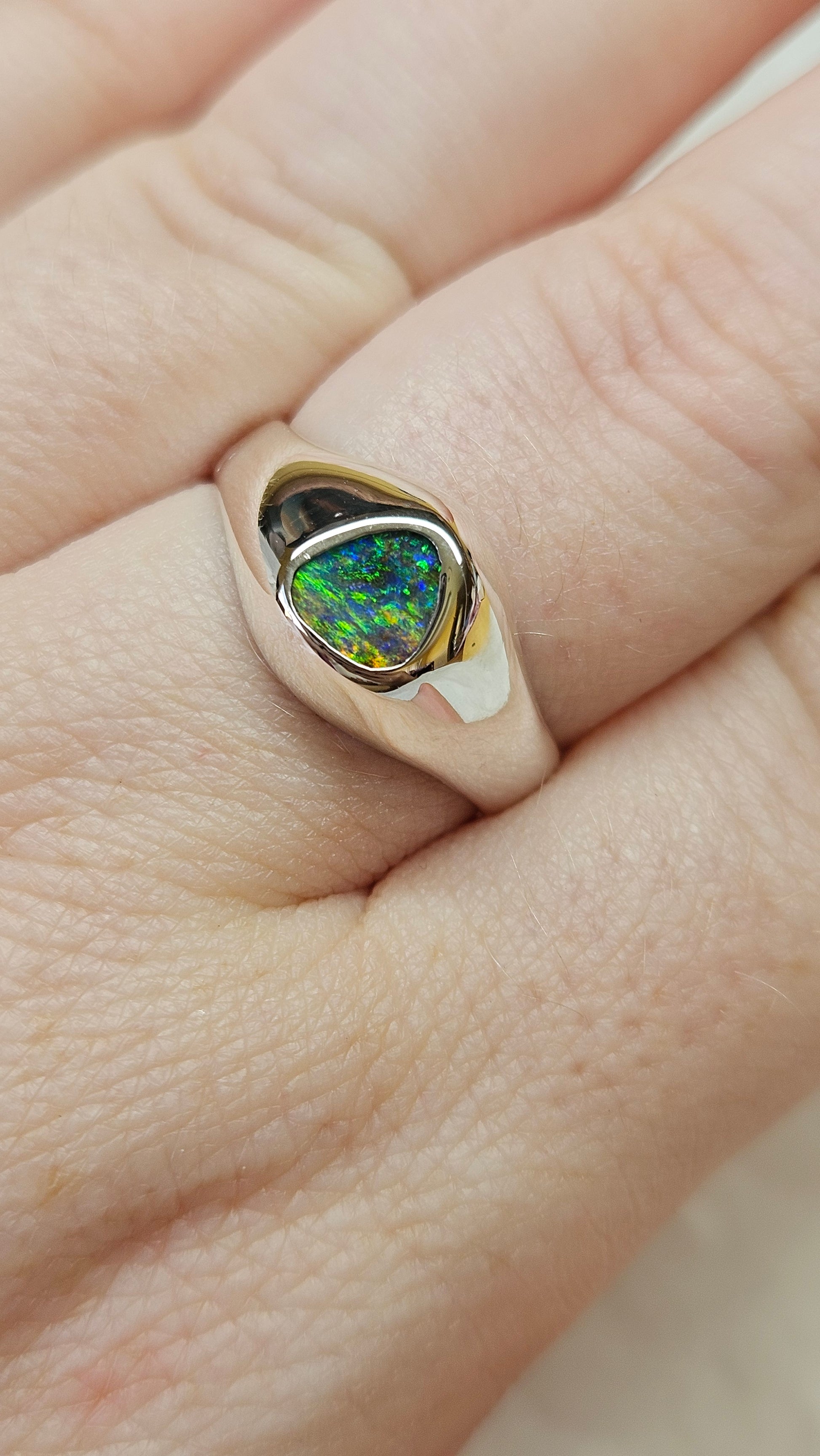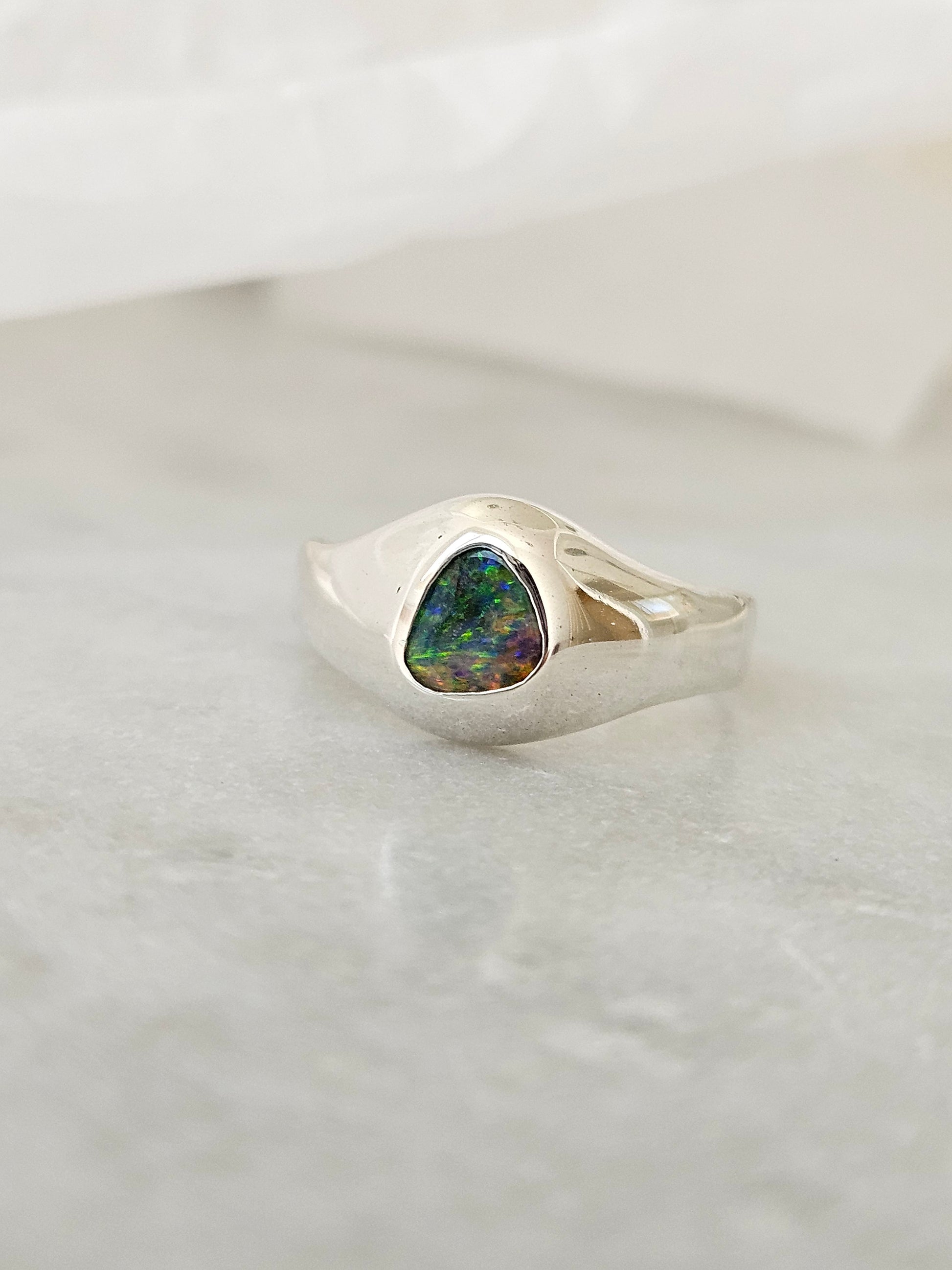 A sleek, high polished signet ring, crafted from Sterling Silver. Set with a Australian Boulder Opal, the Irides ring has a colour shifting glow that feels dreamlike yet refined
