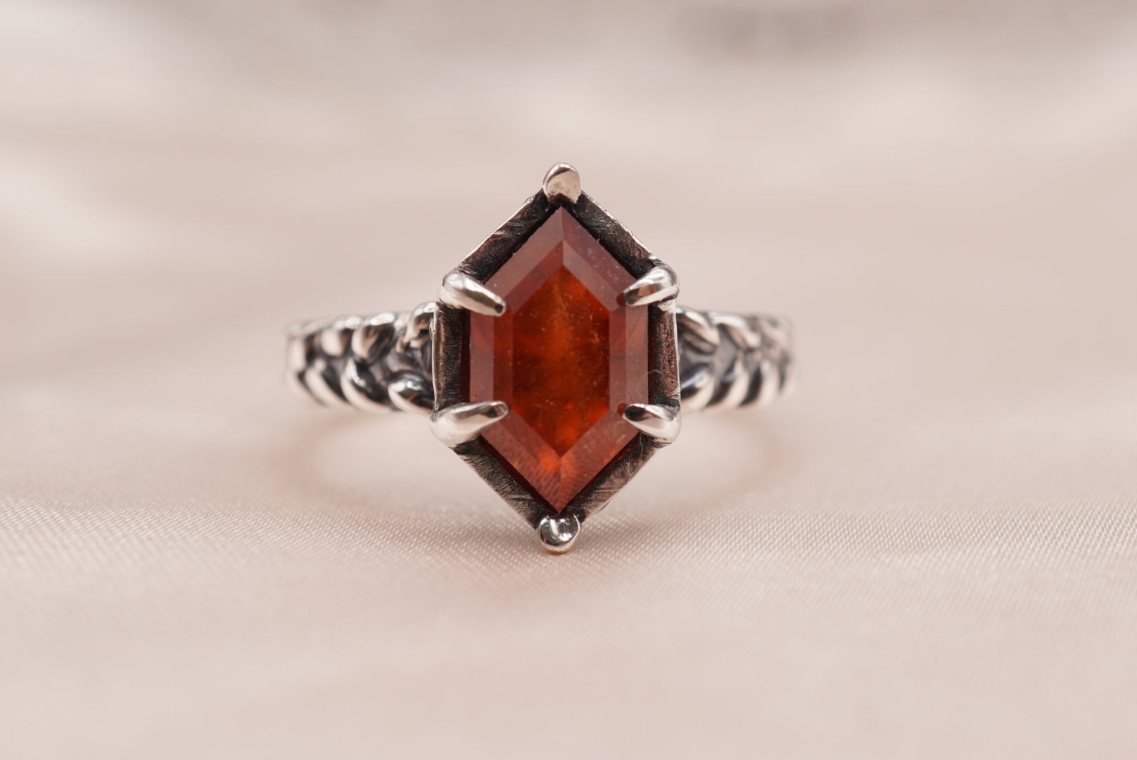 Carefully created in jewellers wax, and cast in recycled Sterling Silver, this statement piece features a claw set Hessonite Garnet. An oxidised finish brings out the texture detail