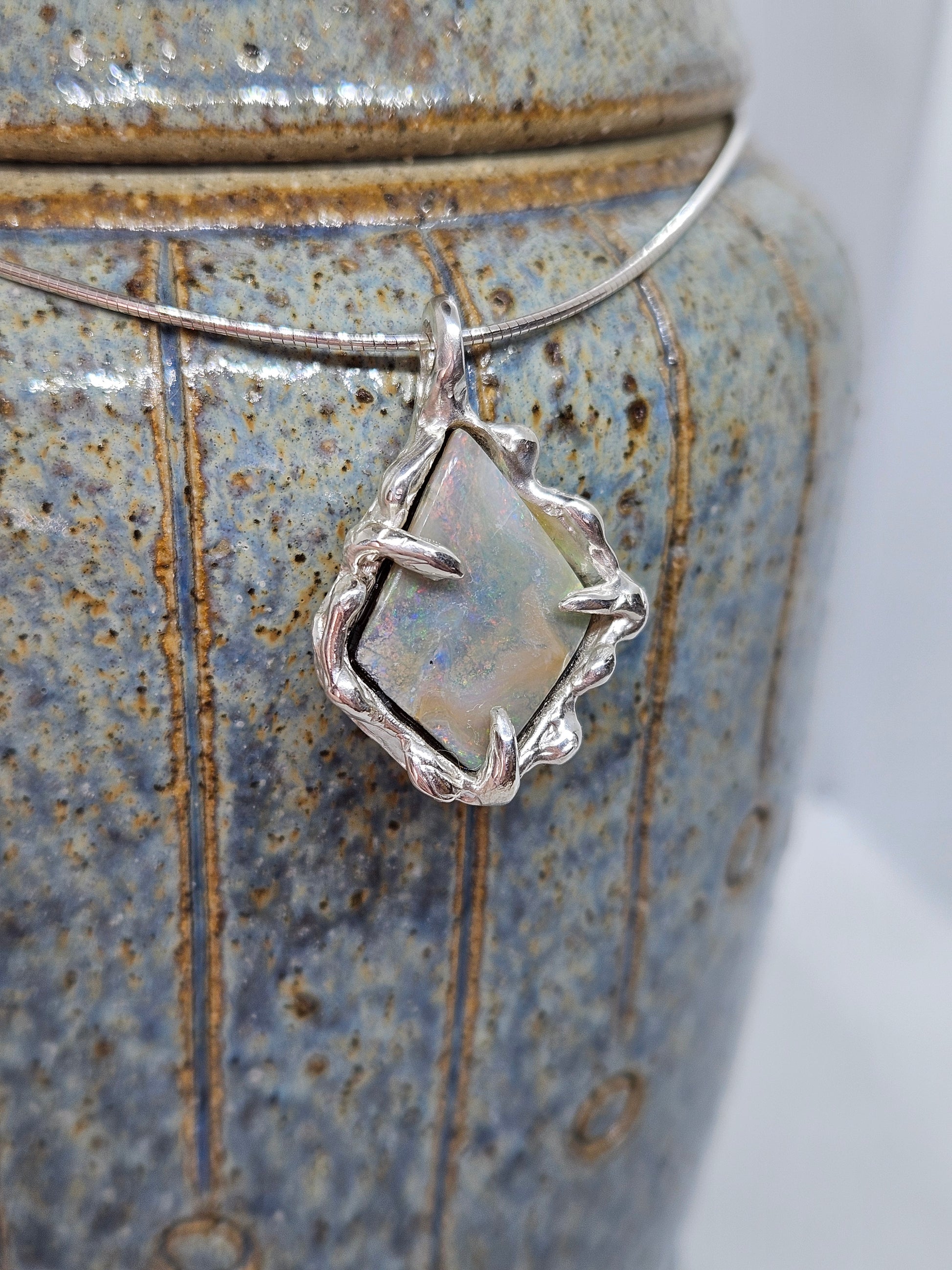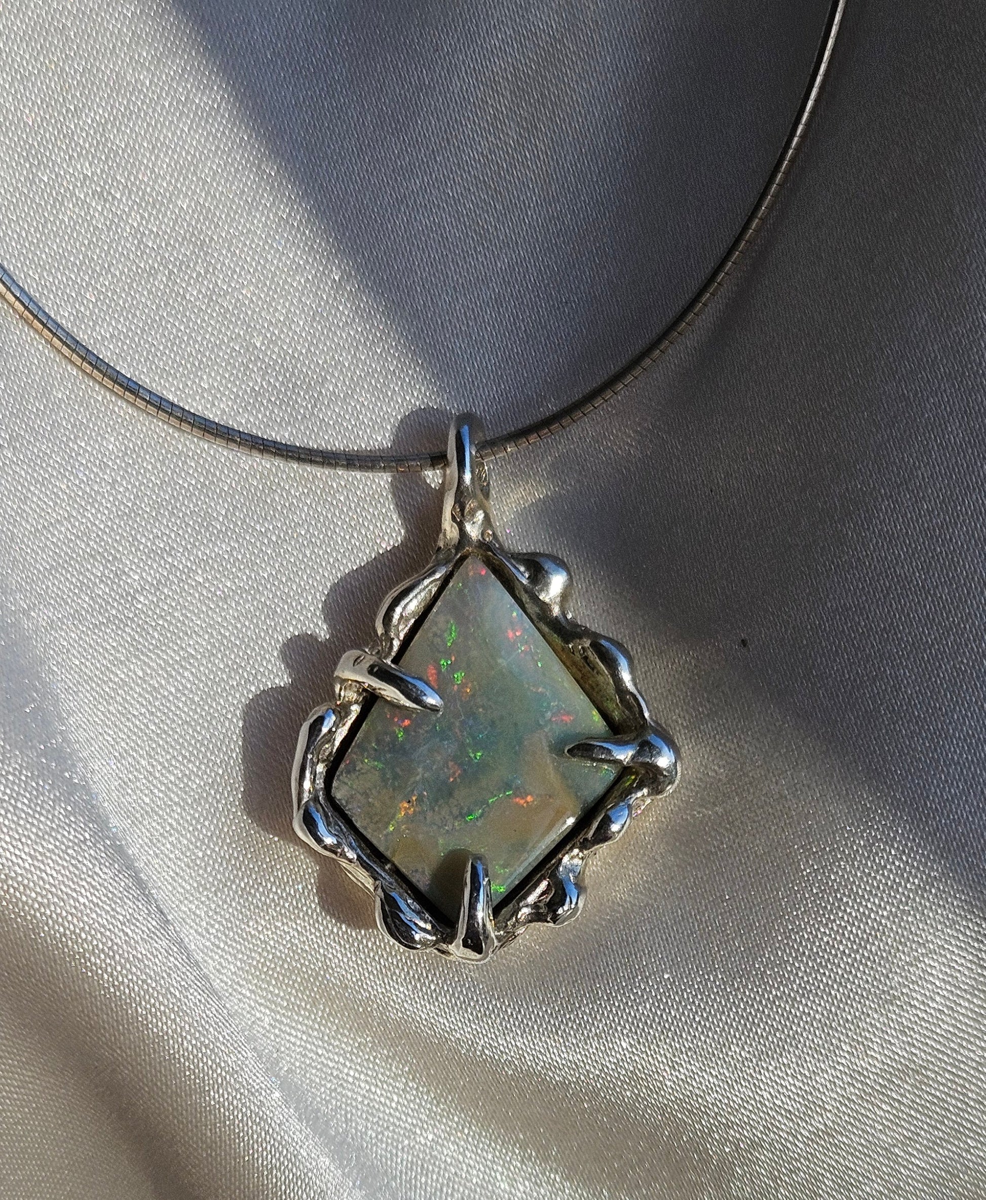 The Tidebound necklace features a chunky Australian Boulder Opal, set in a molten, organic look setting. The colourplay on this opal is quite muted in low light, with vibrant flecks of green, red and orange