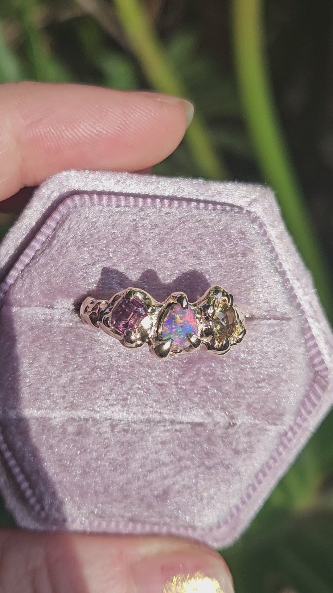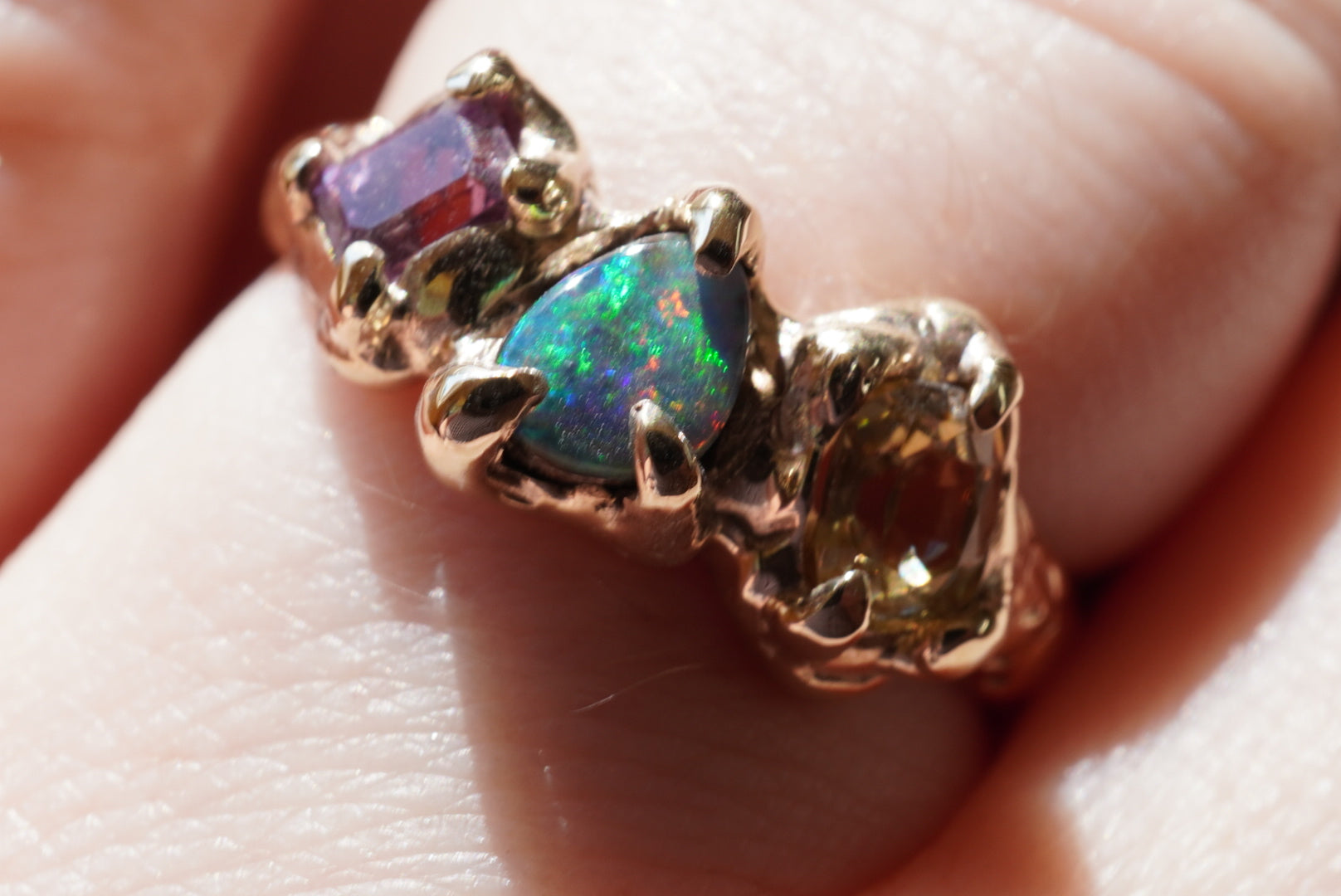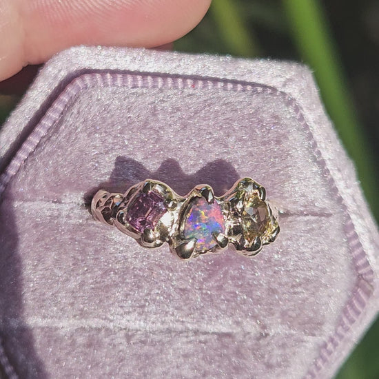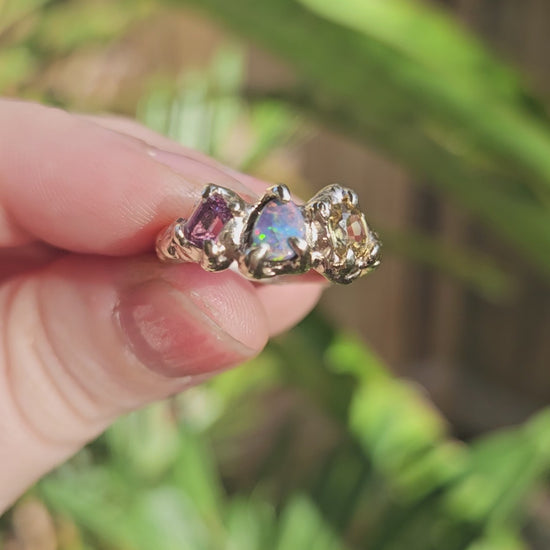 Organic style textured band crafted from recycled 9 karat yellow Gold, and set with an Australian Boulder Opal and two Sapphires - pink and yellow