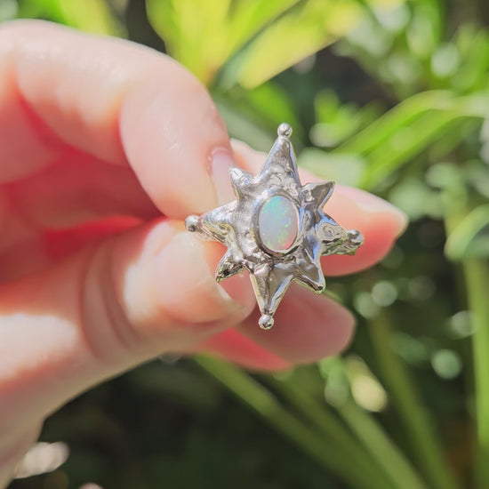 The Enchanted Star Ring is truly one of a kind. Handcrafted out of Wax, cast into Sterling Silver, giving it a molten metal texture. Set at it's heart is the most shimmery, ethereal pastel Australian Opal